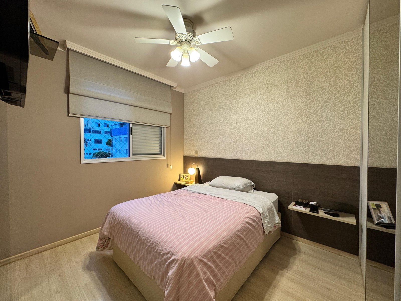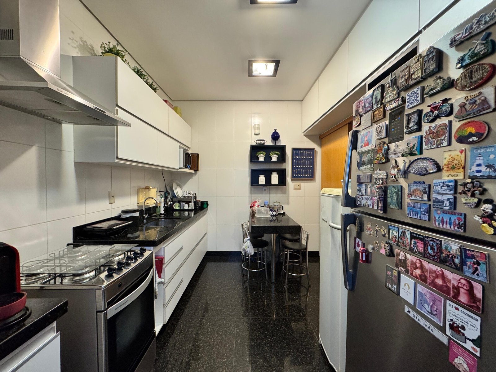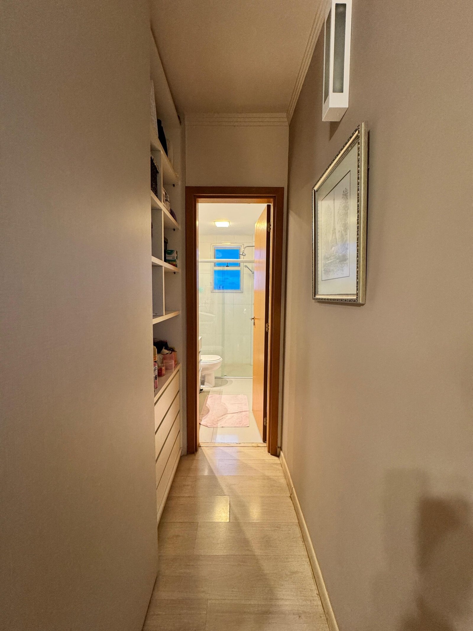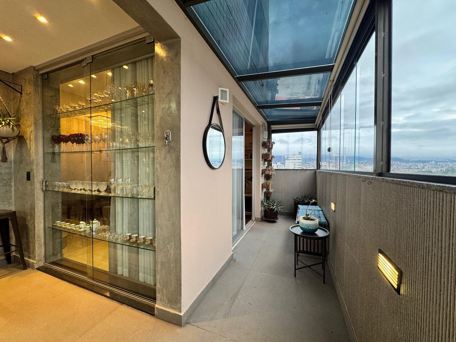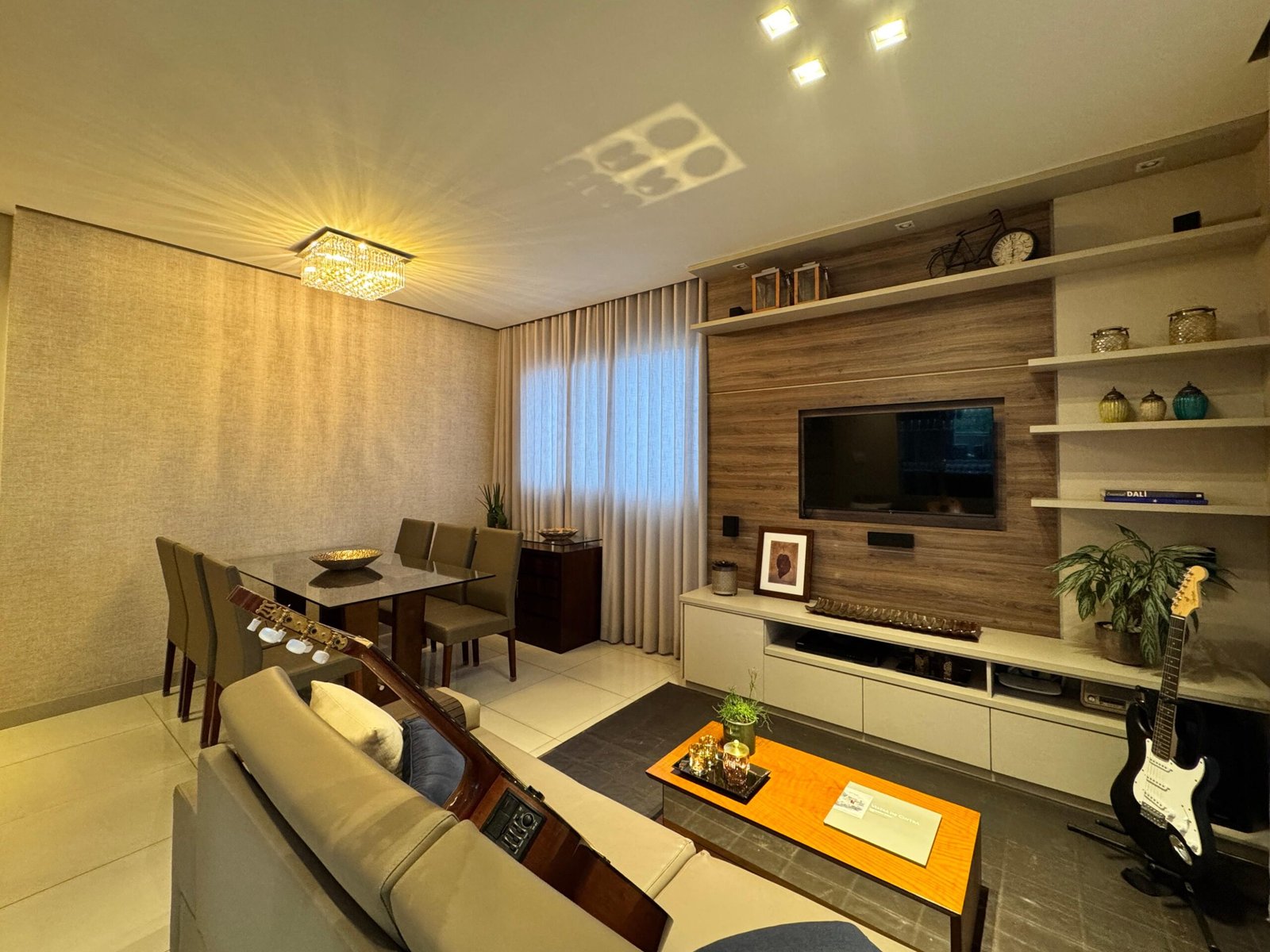 O apartamento conta com sala ampla para dois ambientes, com acabamento em porcelanato, rebaixamento em gesso e uma cristaleira elegante, que agrega charme e sofisticação ao espaço. O lavabo decorado complementa a área social com muito estilo.