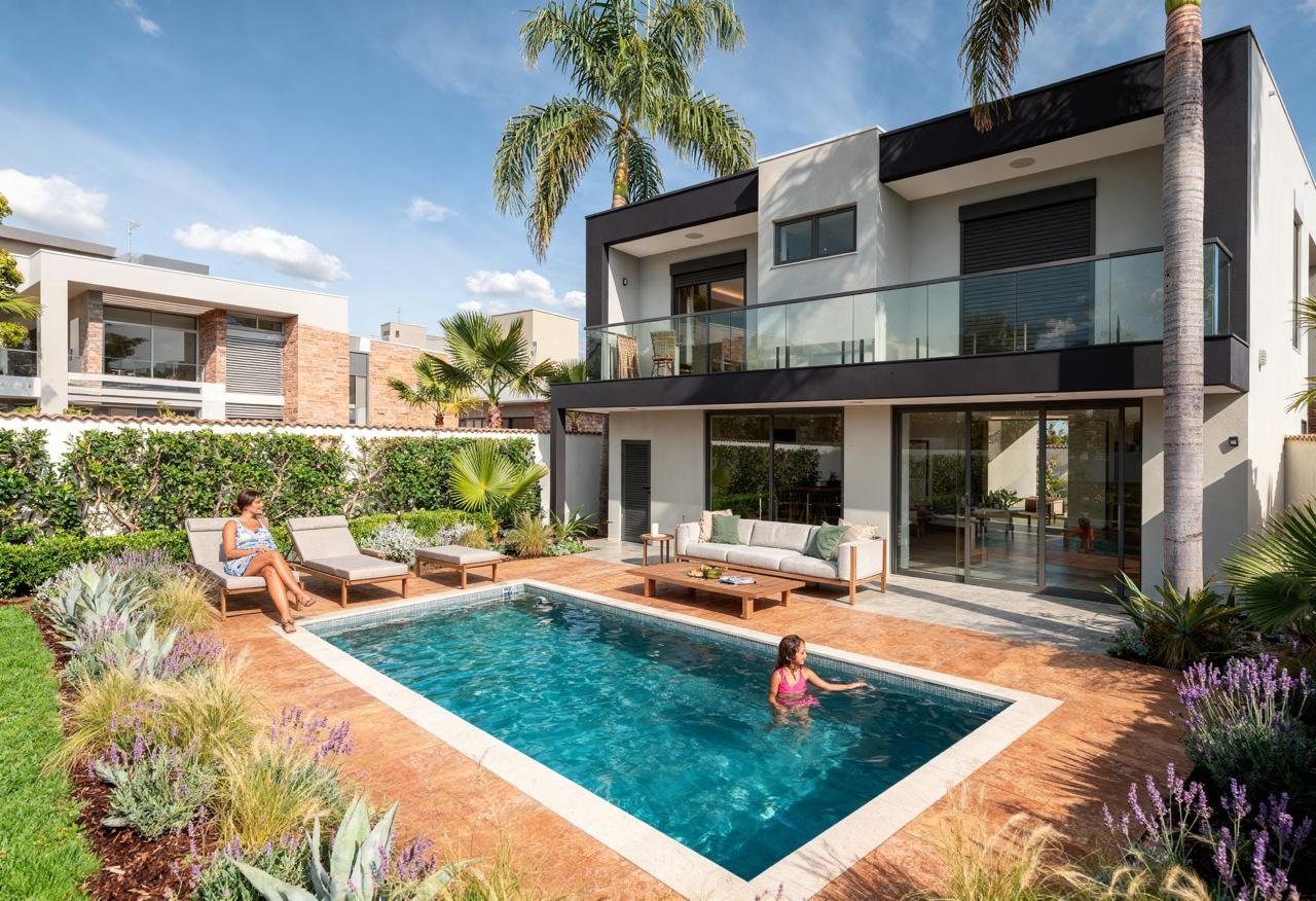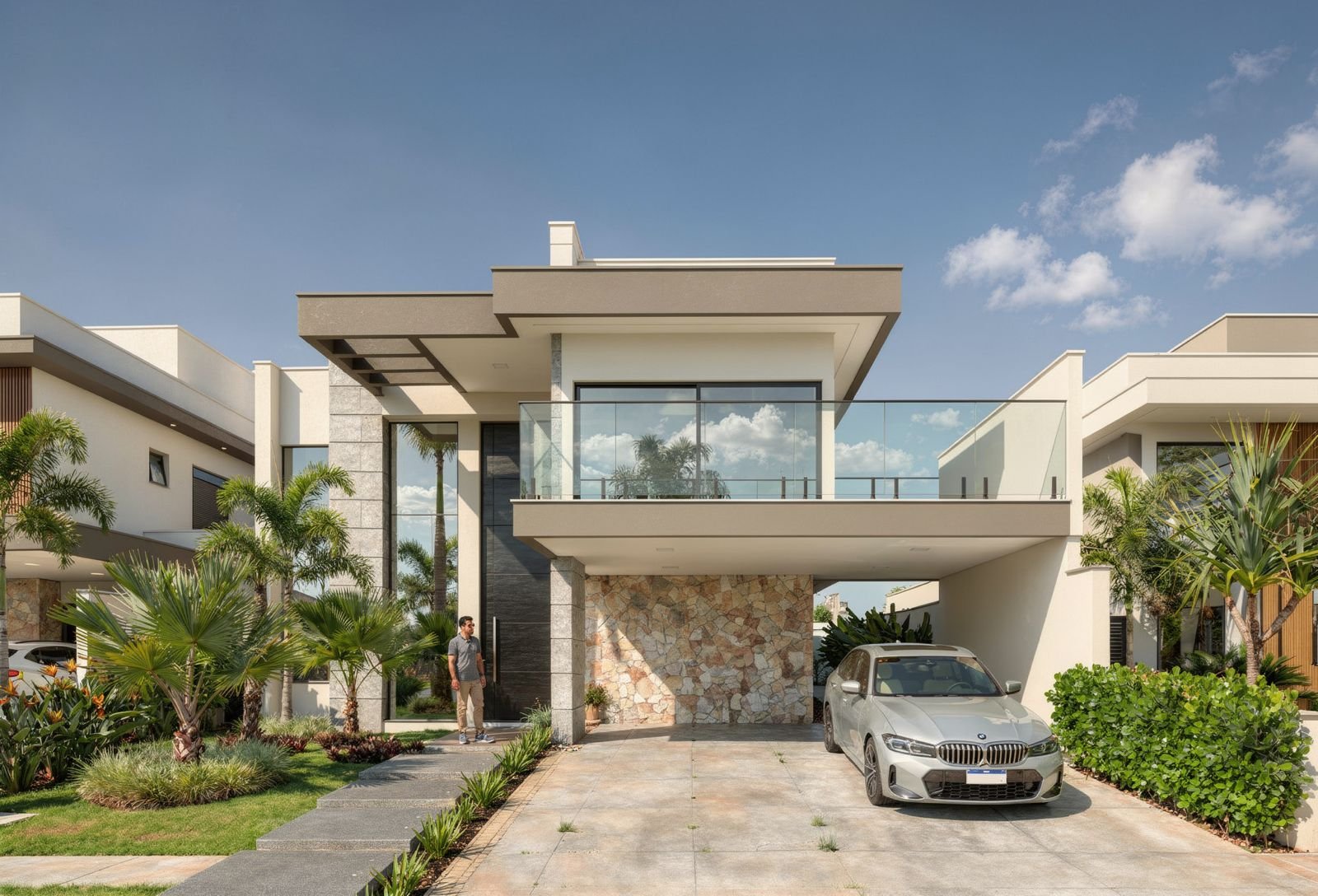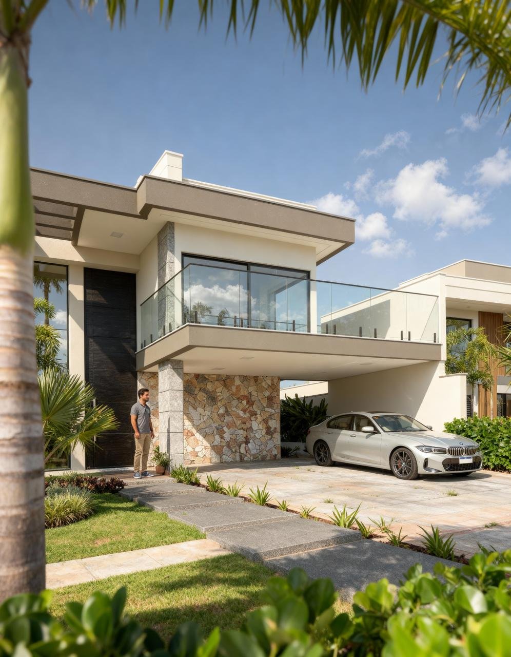 Com 215m² de área construída em um lote de 500m², o projeto foi cuidadosamente concebido para unir imponência arquitetônica, funcionalidade e conforto.