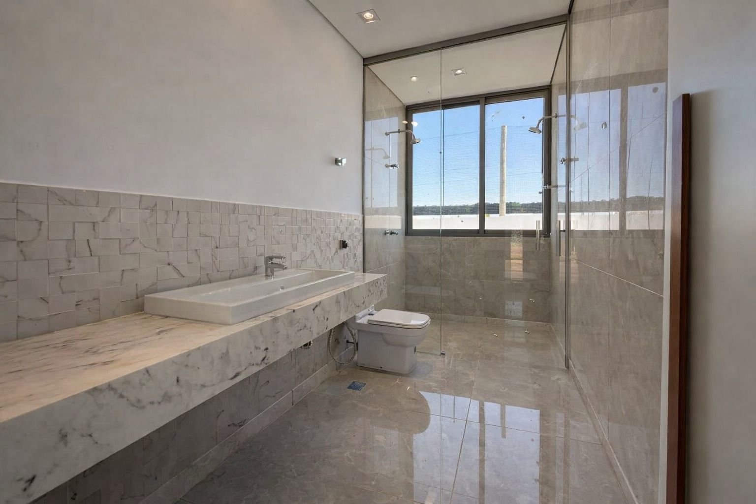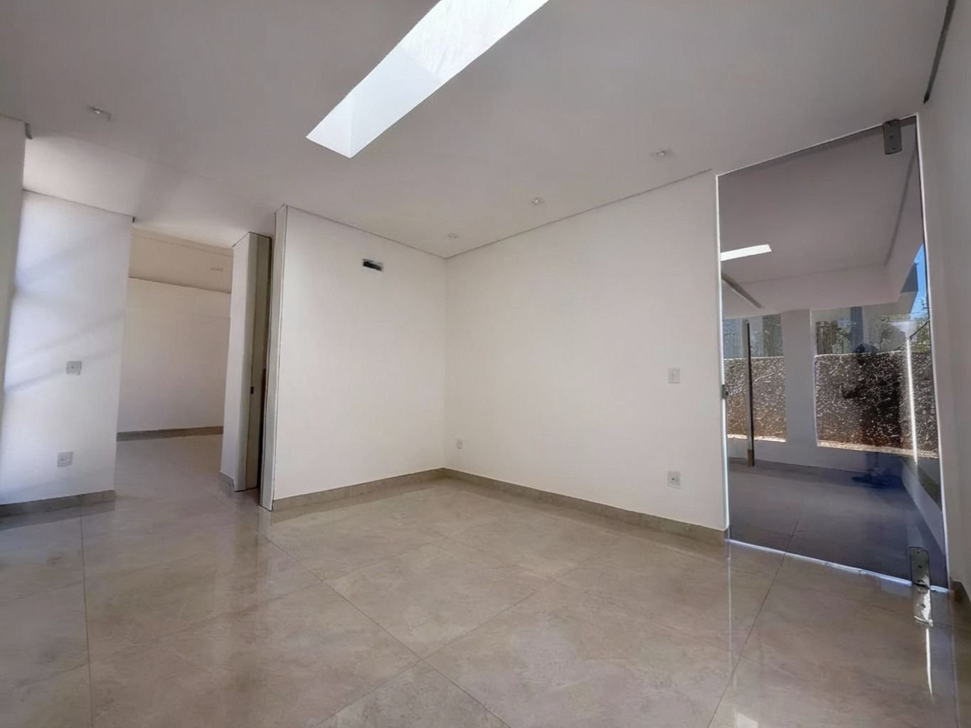 Portas pivotantes com marcenaria customizada, pisos Portobello, esquadrias linha GOLD, persianas motorizadas, claraboias para iluminação natural, aquecimento solar instalado e banheiros entregues com box.