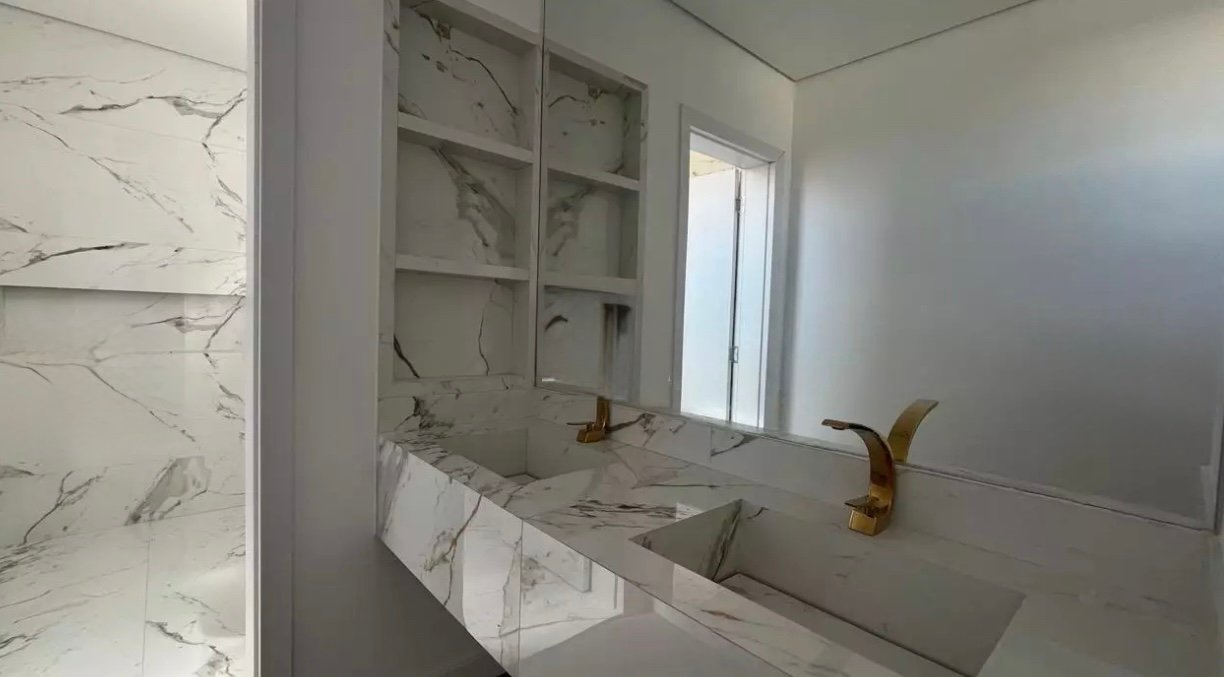 Osram e Stella , bancadas dos banhos esculpidas, bancada da cozinha Quartzo, porta pivotante de ACM, calha úmida e persianas de alumínio preto