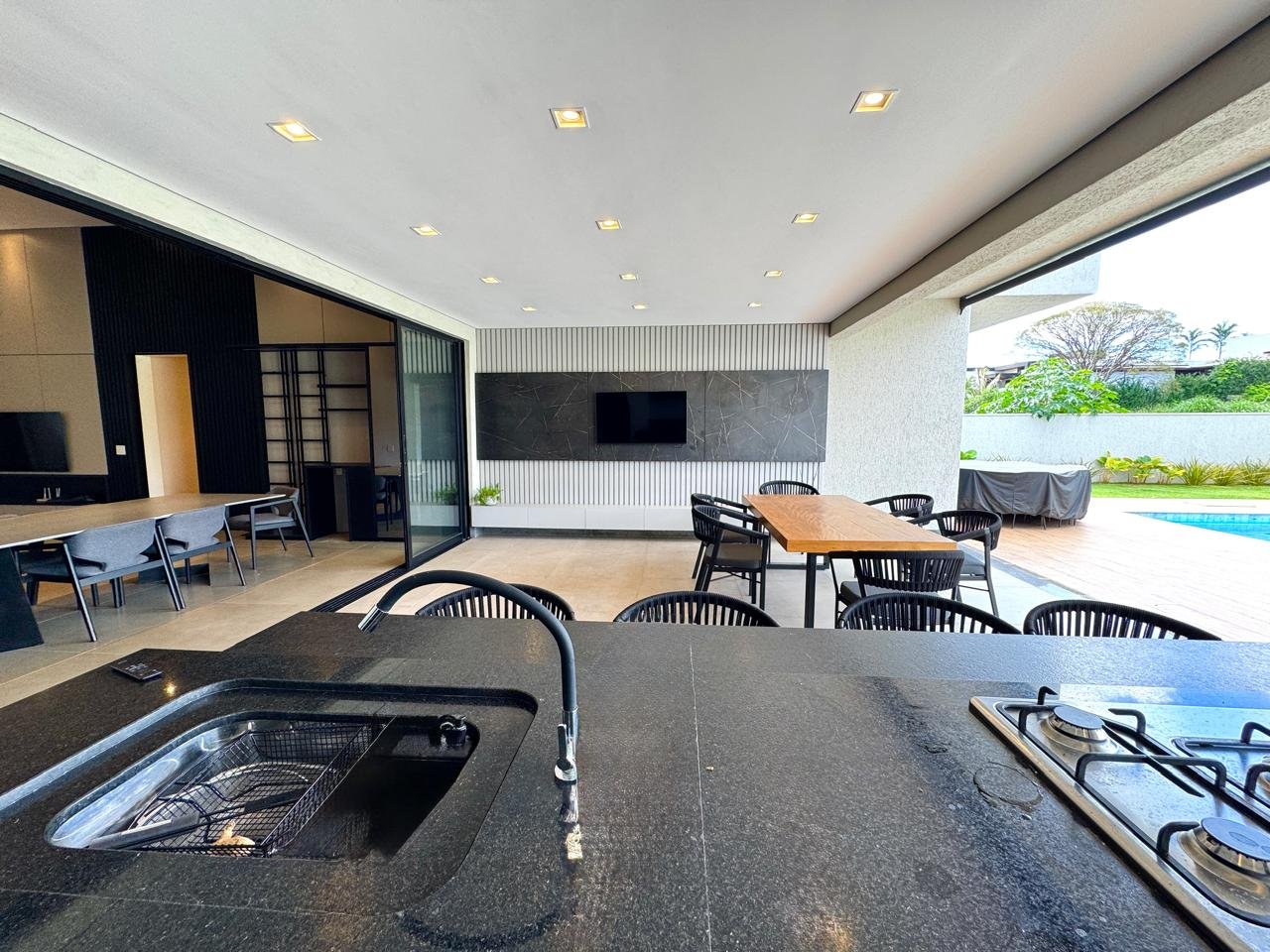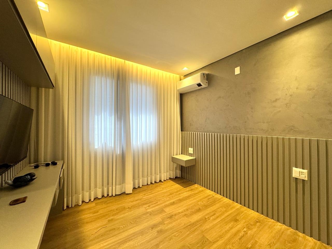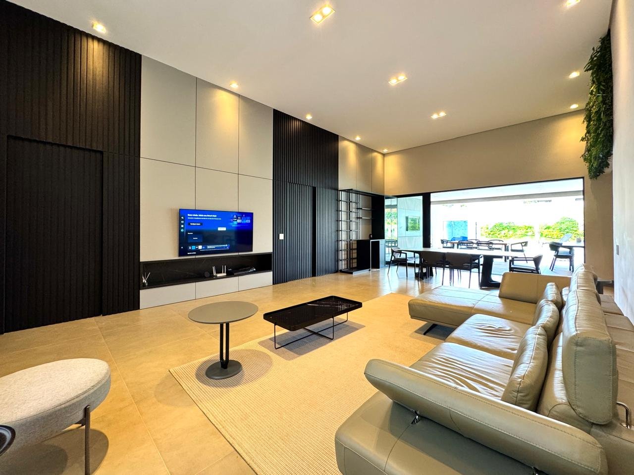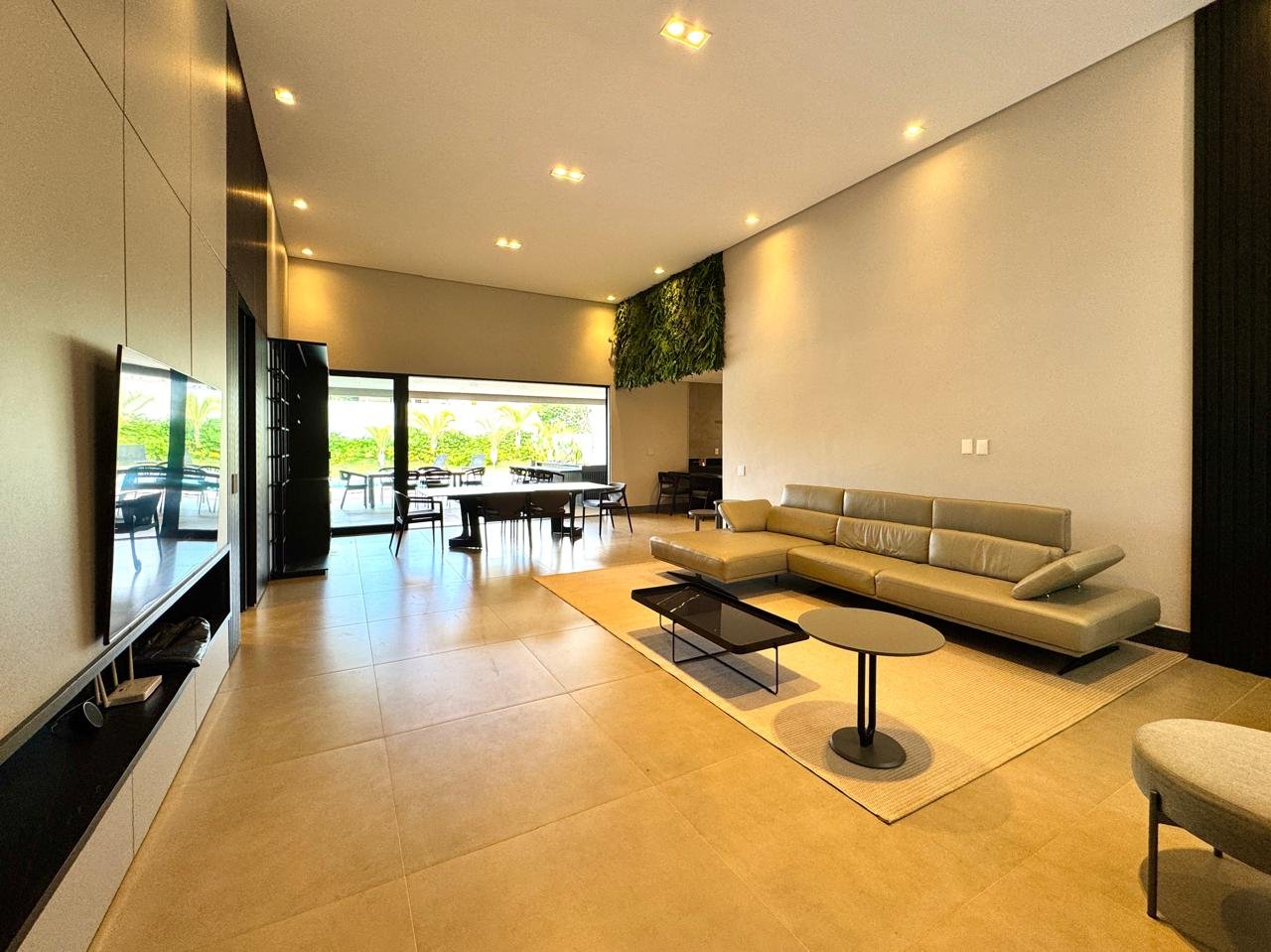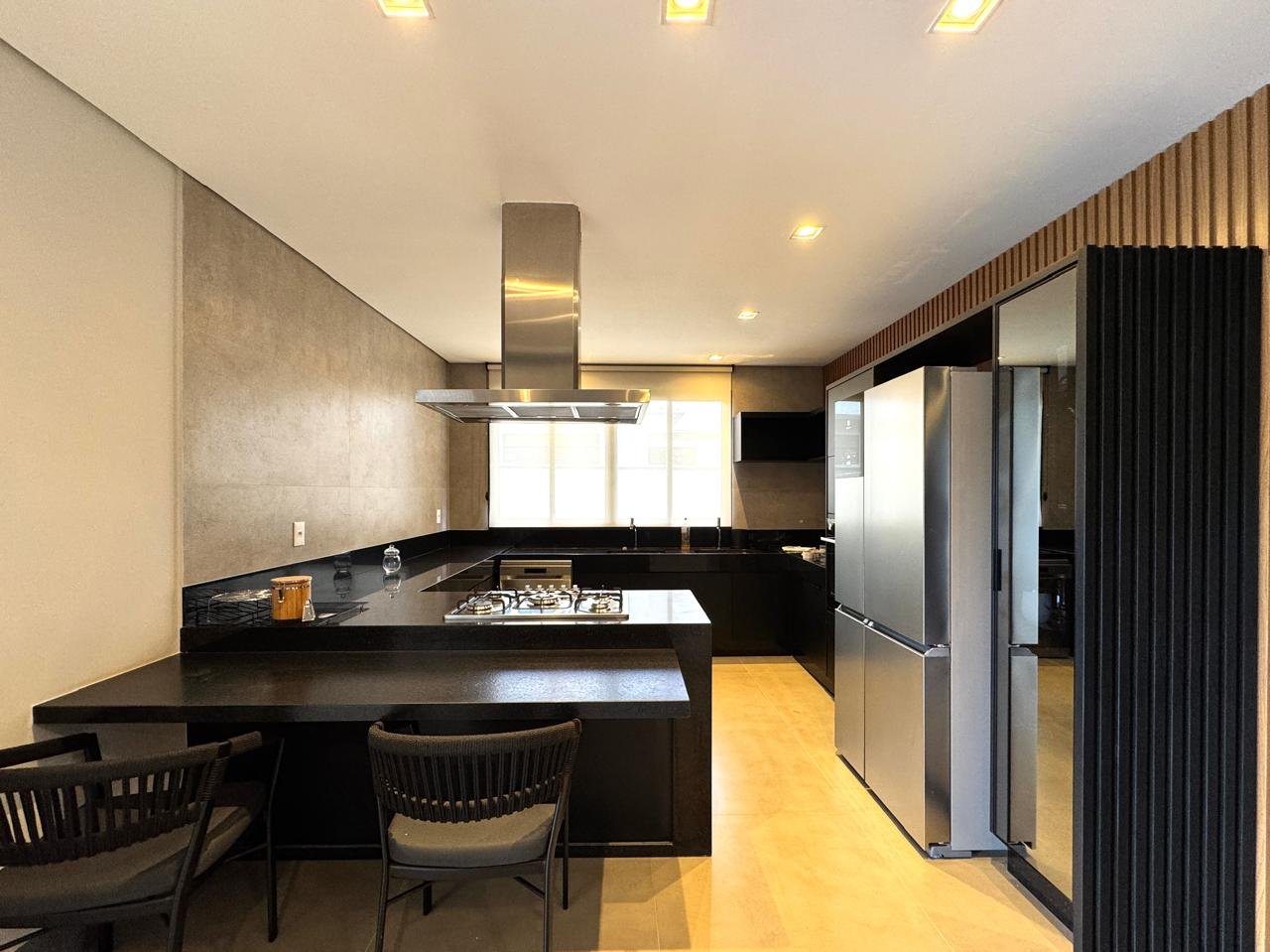O imóvel conta com sala ampla para três ambientes, pé-direito duplo, painel de TV com detalhes ripados, cristaleira e adega.
