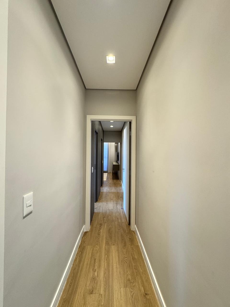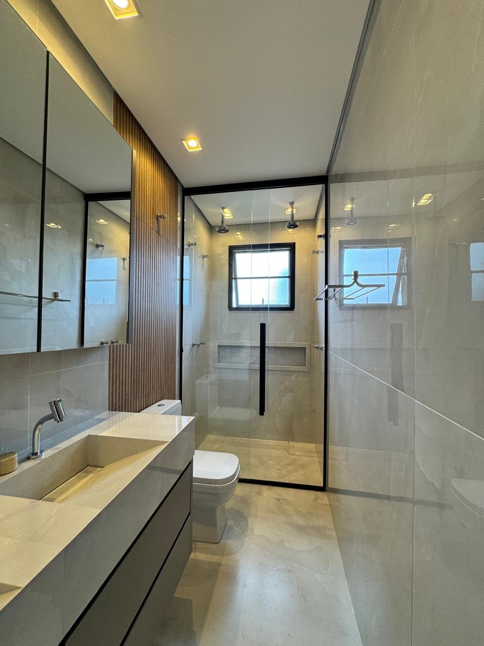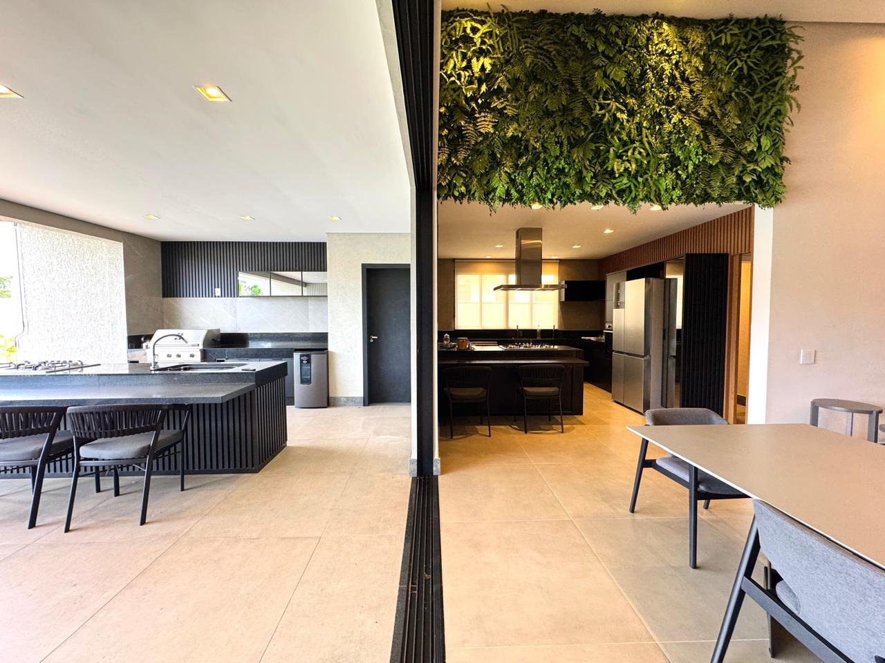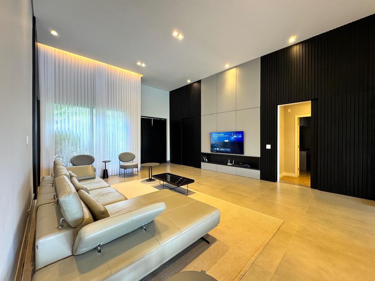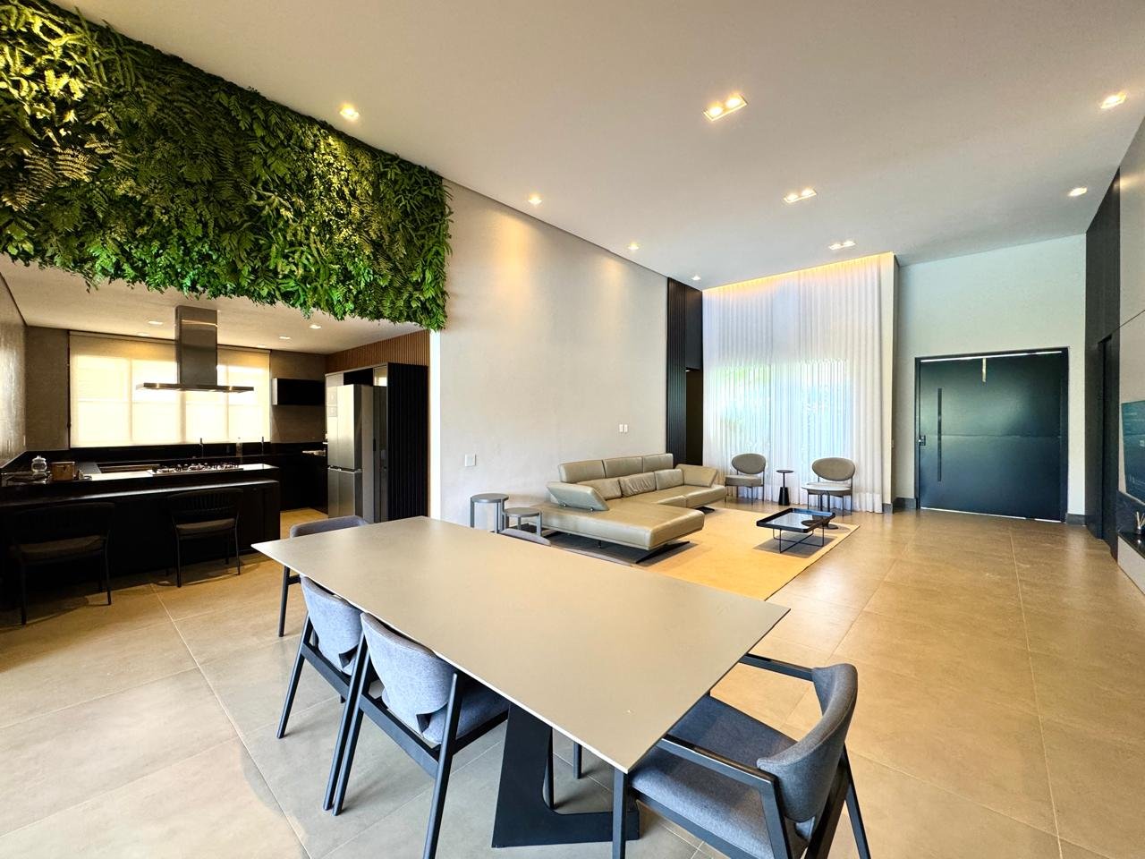 O imóvel conta com sala ampla para três ambientes, pé-direito duplo, painel de TV com detalhes ripados, cristaleira e adega.
