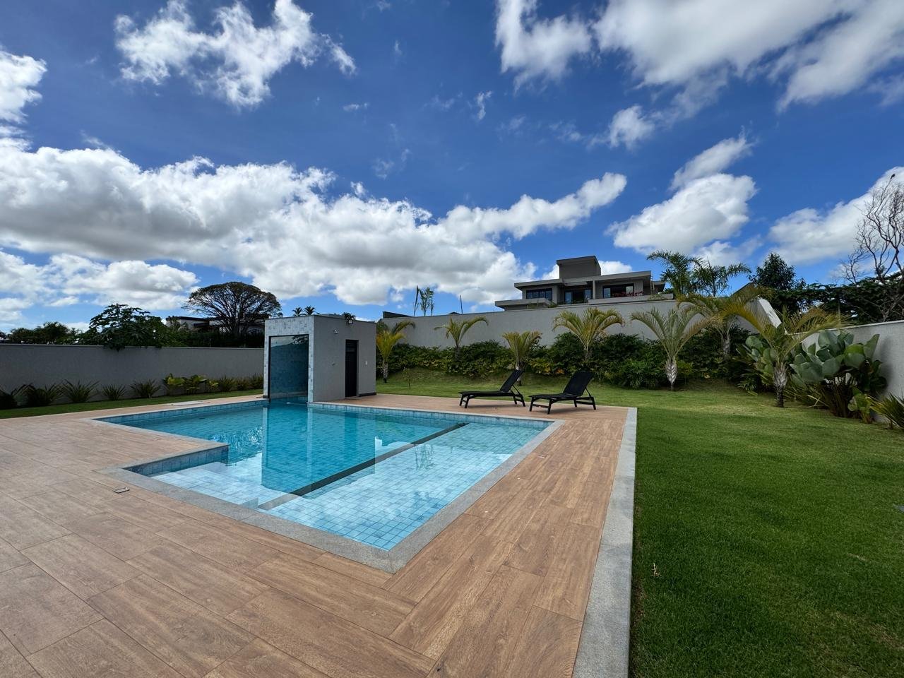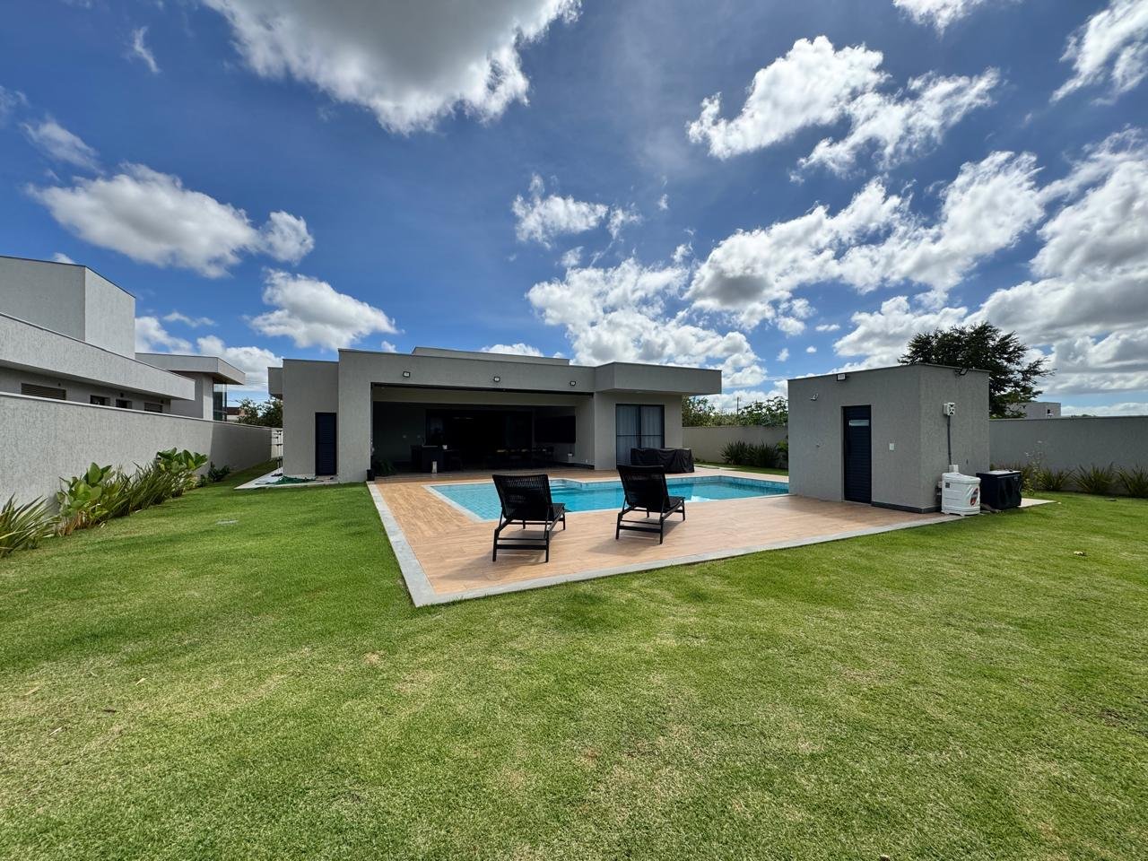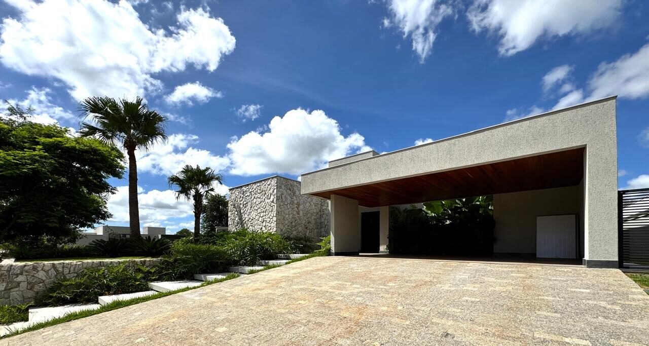 São 325 m² de área construída em um terreno de 1.000 m², com projeto moderno, paisagismo iluminado, irrigação automatizada, sistema de energia fotovoltaica e aquecimento solar.