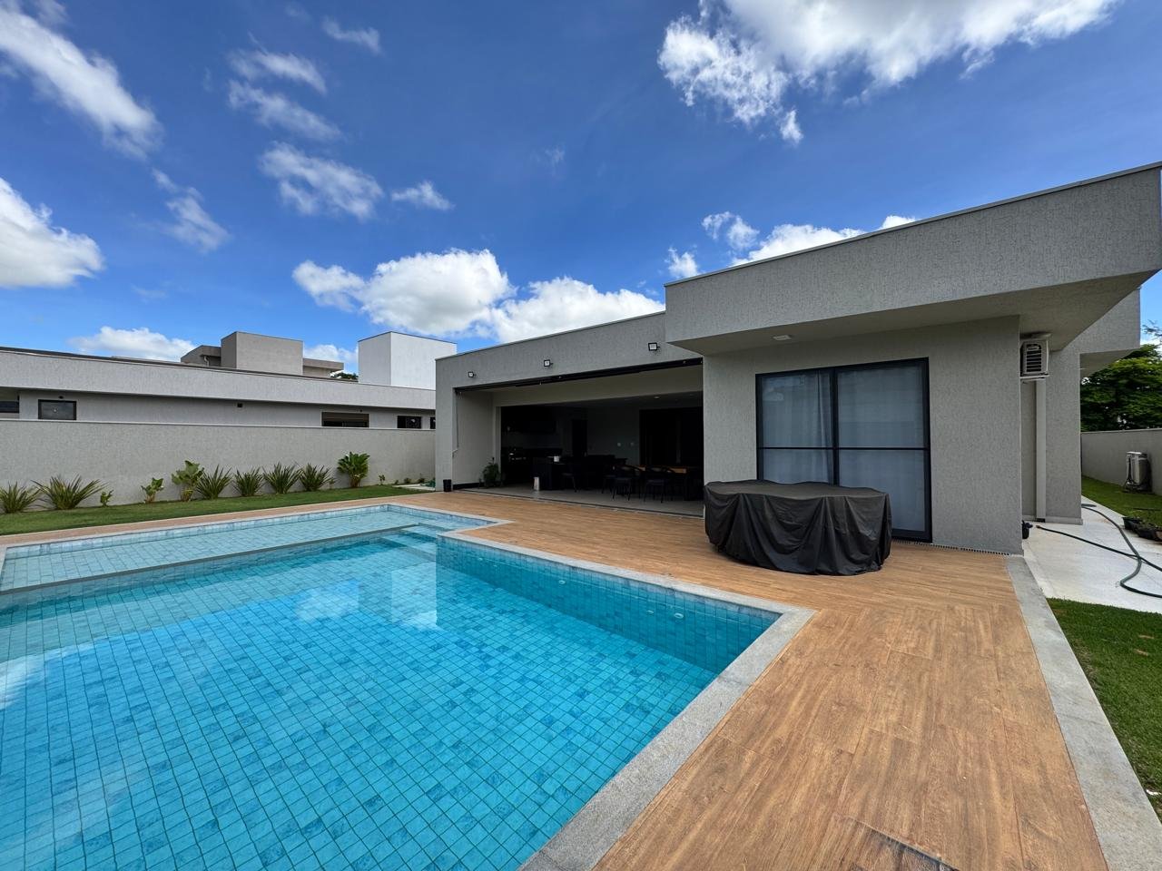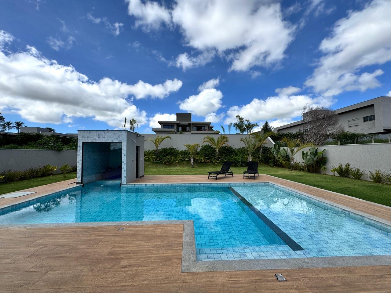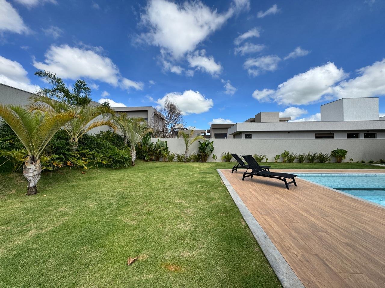 São 325 m² de área construída em um terreno de 1.000 m², com projeto moderno, paisagismo iluminado, irrigação automatizada, sistema de energia fotovoltaica e aquecimento solar.